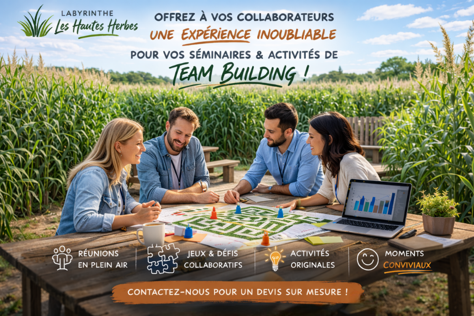 📞 Contactez le Labyrinthe Les Hautes Herbes pour recevoir nos tarifs et construire ensemble un événement professionnel qui marquera durablement vos équipes.